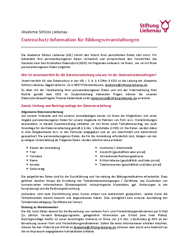 Wir freuen uns über Ihr Interesse an unserem Kursangebot. Bitte melden Sie sich direkt über die aufgeführten Kurse oder gezielt – zum Beispiel mit der Kursnummer – über den Kursfinder online an. Es gelten die Teilnahmebedingungen der Akademie Schloss Liebenau.